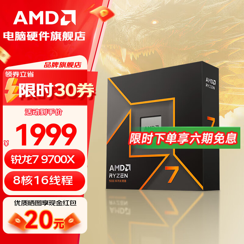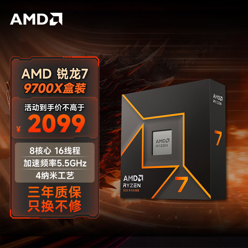 【双11】AMD R7-5700X 锐龙5代 CPU处理器 8核16线程 加速频率至高4.6GHz