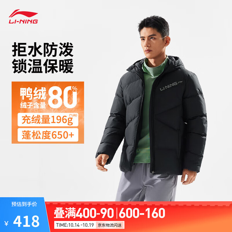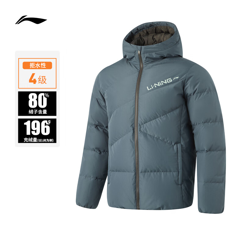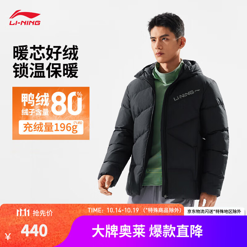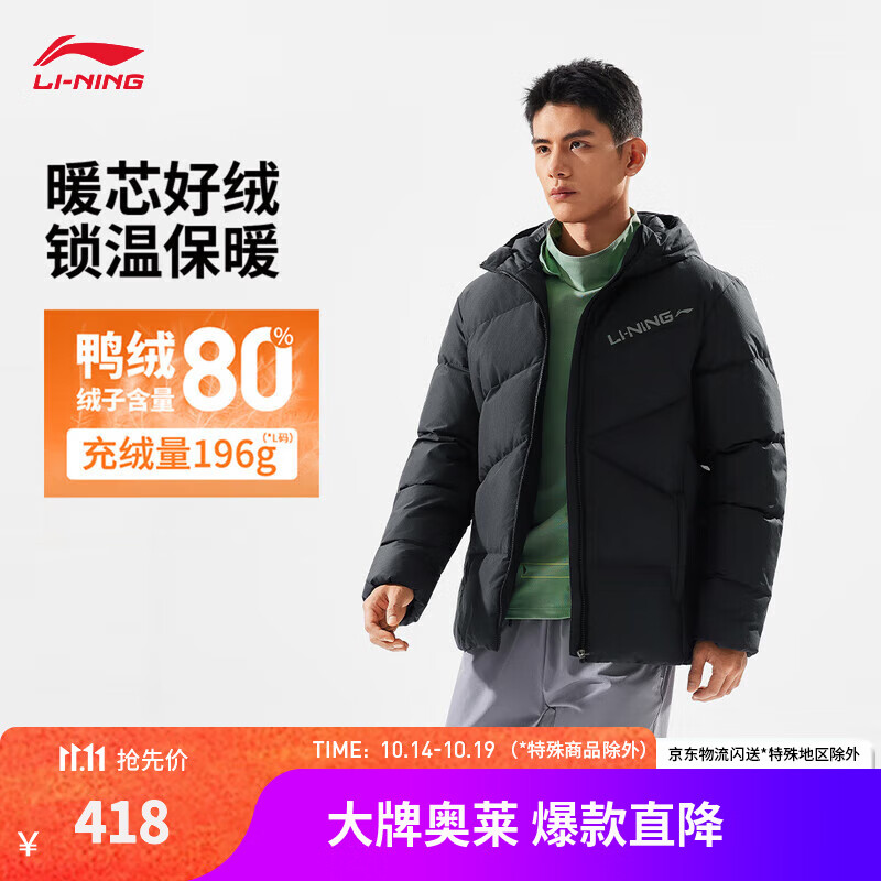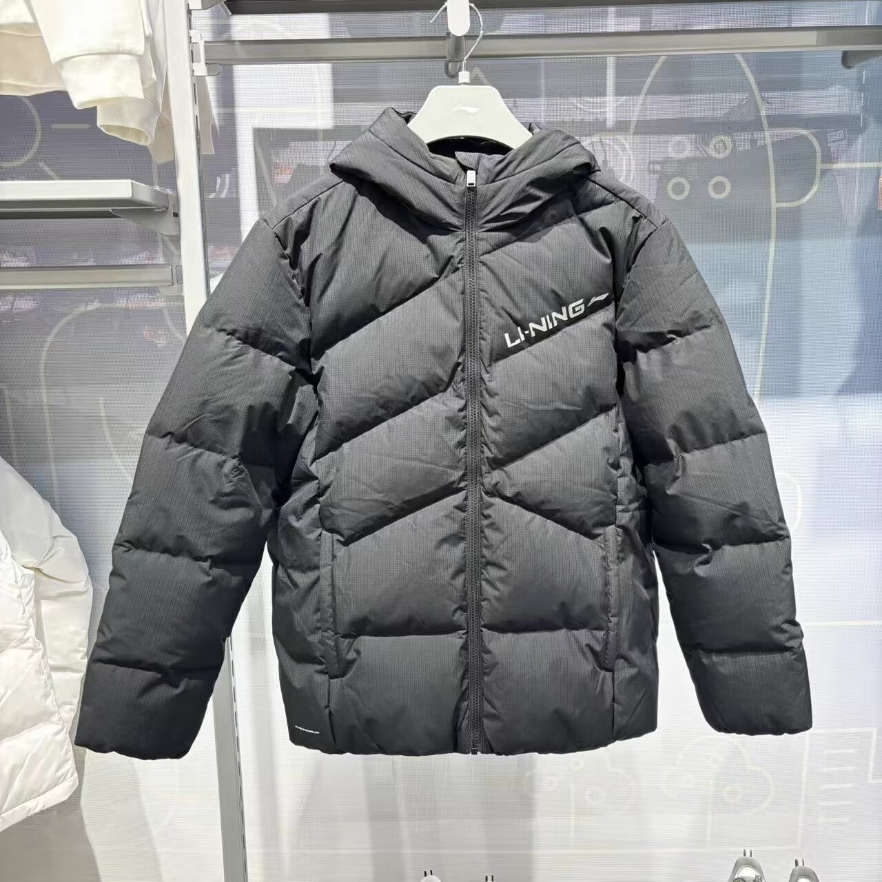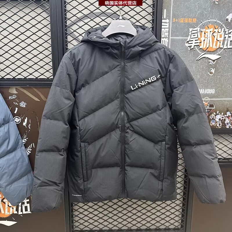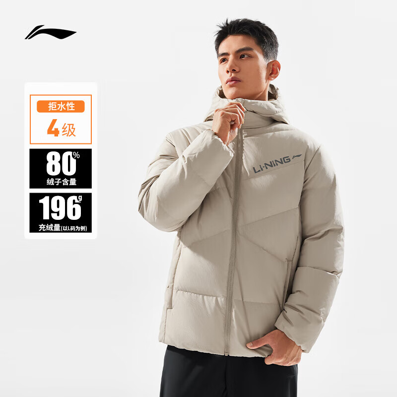 【肖战同款】Li Ning/李宁 男子健身系列品牌LOGO防风加厚抗寒锁温防泼水连帽拉链长袖立体裁剪修身热卖款拒水短款鸭绒羽绒服 AYMU079