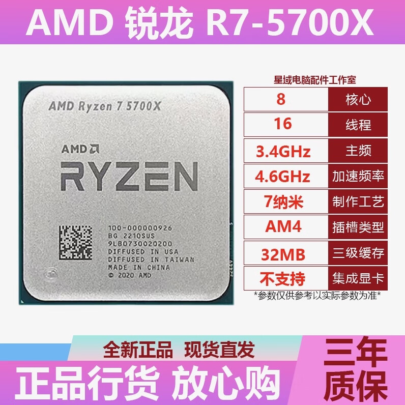 【双11】AMD R7-5700X 锐龙5代 CPU处理器 8核16线程 加速频率至高4.6GHz
